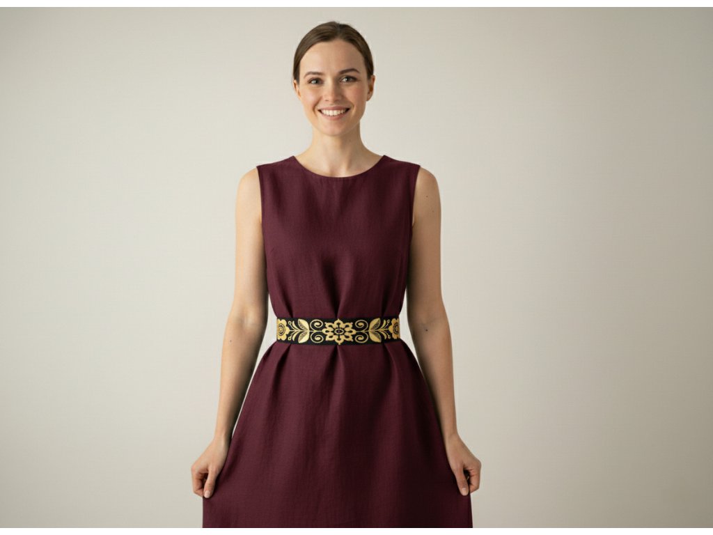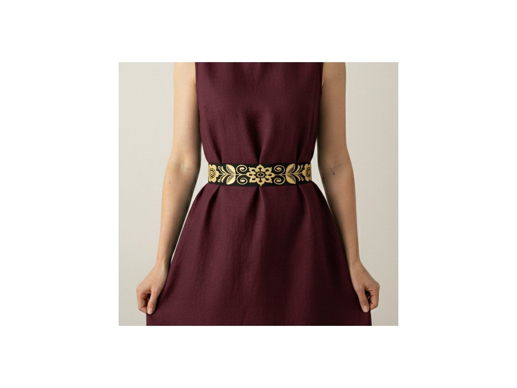 Opasok je strojovo vyšívaný. Základom je čierny bavlnený podklad na ktorom sú vyšité zlaté kvetované ornamenty. Opasok je z bavlnenej látky a vo vnútri je kvalitne vystužený, aby dobre držal tvar. Šírka opasku je rovnaká v celej jeho dľžke. V zadu sa viaže pomocou dvojitej stuhy v čiernej farbe. Údržba - najlepšie prať pri 30 stupňoch C, jemne vyžmýkať a nechať voľne osušiť. Prežehliť z rubovej strany, líc cez bavlnené plátno.