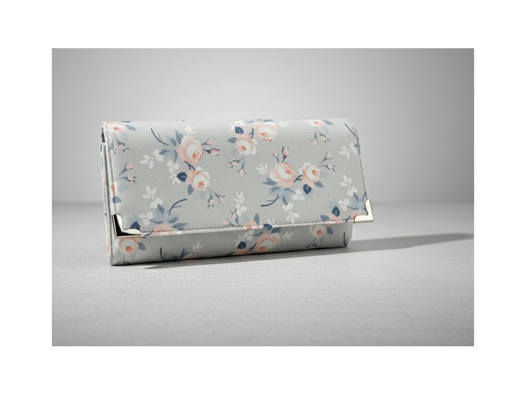 Elegantná a praktická dámska peňaženka, vyrobená z bavlny. Je spevnená a vystužená, aby dobre držala tvar. Vo vnútri je vybavená priehradkami na bankovky, zazipsovateľnou priehradkou na drobné a 12-timi priehradkami na platobné a iné karty. Rohy má vystužené kovovými, ozdobnými rohovníkmi v striebornej farbe.