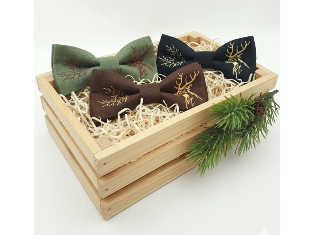 Každý kus je vyrobený z prírodnej bavlny, ktorá je príjemná na dotyk, neleskne sa umelo a výborne drží svoj tvar. Dominantou motýlika je kvalitná a detailná strojová výšivka s motívom jeleňa, ktorá symbolizuje silu a majestátnosť našich lesov.